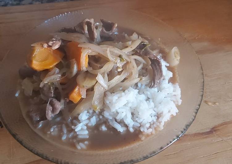 - Pones el corazón Con un chorro de aceite lo saturas lo apartas para lo último.con el jugo poner las cebollas hasta que este transparente mandar los otras verduritas.poner después la salsa de soja.una vez que esté todo agregar el vaso de cerveza..